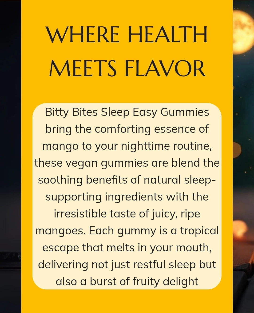 Naturally made sleep gummies to find you a peaceful good night sleep. Just 1 gummy 30 minutes before bed!